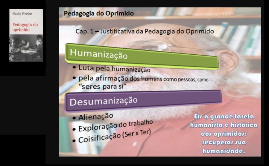Em seu primeiro capítulo que tem como título “Justificativa da Pedagogia do Oprimido”, Paulo Freire (1987, p. 16) discute o processo de desumanização causada pelo opressor a seus oprimidos “[…] desumanização, que não se verifica apenas nos que têm sua humanidade roubada, mas também, ainda que de forma diferente, nos que a roubam, é distorção da vocação do ser mais”.