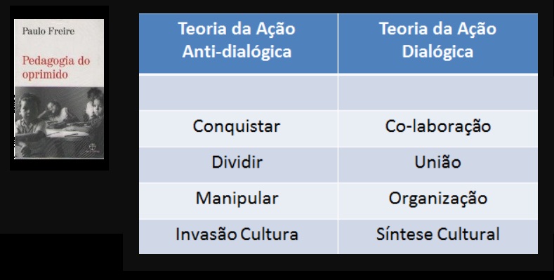 A teoria da ação antidialógica, centrada na necessidade de conquista e na ação dos dominadores, que preferem dividir para manter opressão, deixar que a invasão cultural e a manipulação desqualifiquem a nossa identidade. Após tal critica, apelas e interperla-nos com um convite a unir para libertar, através da colaboração organização que nos conduzirão à sintase cultural, que considera o ser humano como ator e sujeito do seu processo histórico. Ainda mais sobre a teoria antidialógica, Paulo Freire, ressalta que a referida teoria tanto traz a marca da opressão, da invasão cultural camuflada, da falsa admiração do mundo, como lança mão de mitos para manter o status quo e manter a desunião dos oprimidos, os quais divididos ficam enfraquecidos e tornam-se facilmente dirigidos e manipulados.